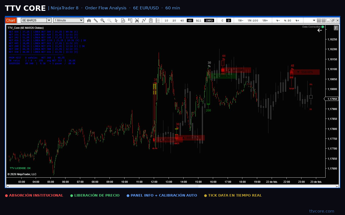 TTV Core es un indicador profesional de order flow para NinjaTrader 8. Diseñado para identificar zonas donde la liquidez institucional estuvo activa — absorción real y liberación de precio — directamente sobre el chart, en tiempo real.